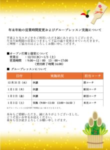 年末年始の営業時間変更およびグループレッスン実施について